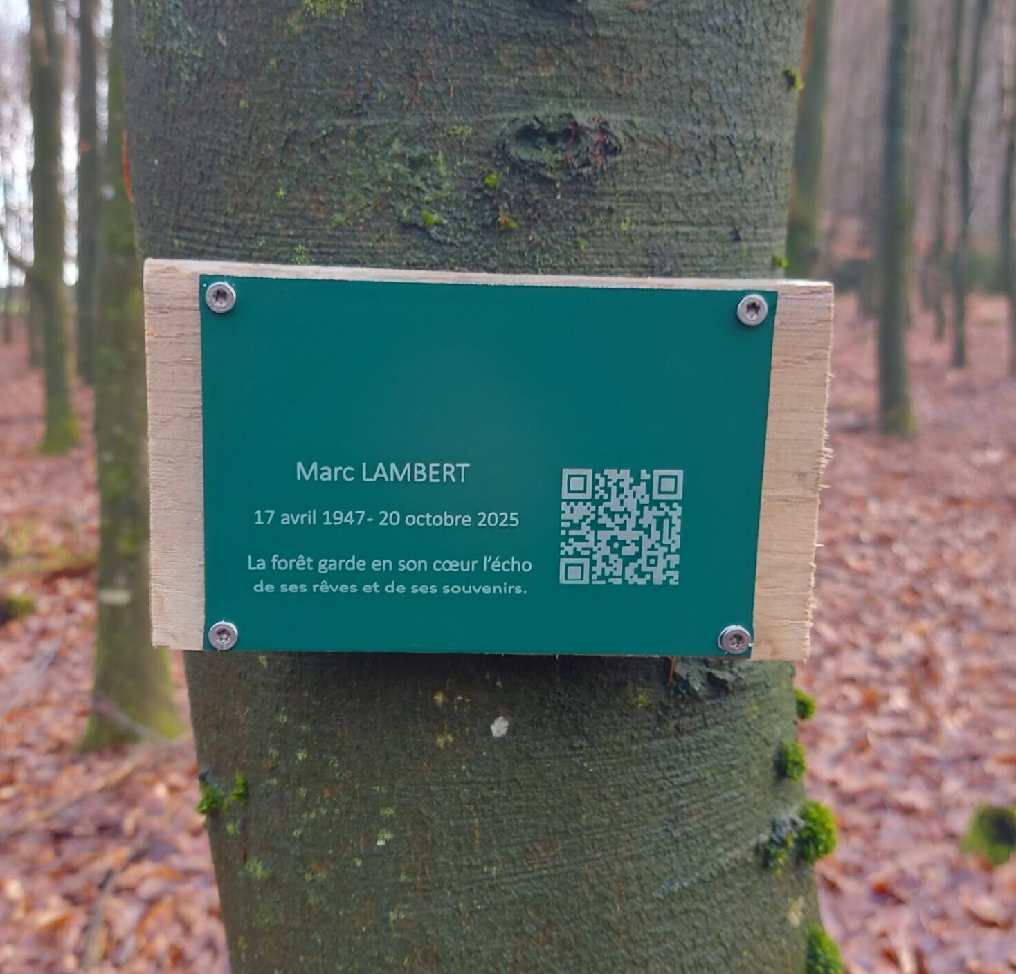 - Plaquette commémorative personnalisée posée sur l’arbre